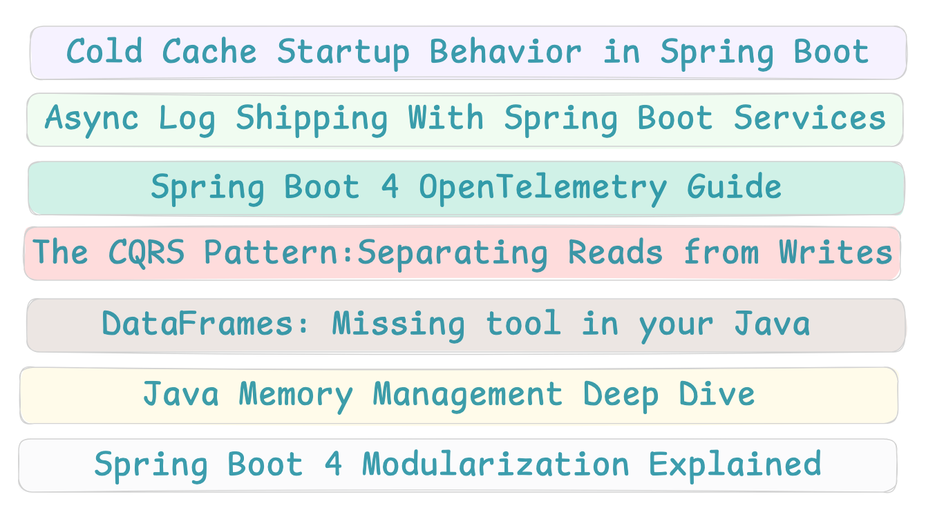 spring-boot-starter-opentelemetry) that bundles tracing, metrics, and OTLP export support, eliminating the need for manually adding many individual dependencies like in earlier versions. With it, we can export metrics, traces, and logs via OTLP to observability backends, automatically instrument common components (HTTP, JDBC, etc.), and configure exporters and sampling through properties. This simplifies adding full observability to cloud-native Spring Boot apps.The CQRS Pattern: Separating Reads from Writes for Scalable Architectures: The Command Query Responsibility Segregation (CQRS) pattern separates writes (commands) from reads (queries) into different models so each can be optimized and scaled independently. This helps systems with high read‑to‑write ratios or complex business logic, but it adds operational complexity, eventual consistency, and coordination challenges. CQRS works well when read and write demands differ widely, but for many apps, a traditional CRUD design with caching or replicas is simpler and sufficient.