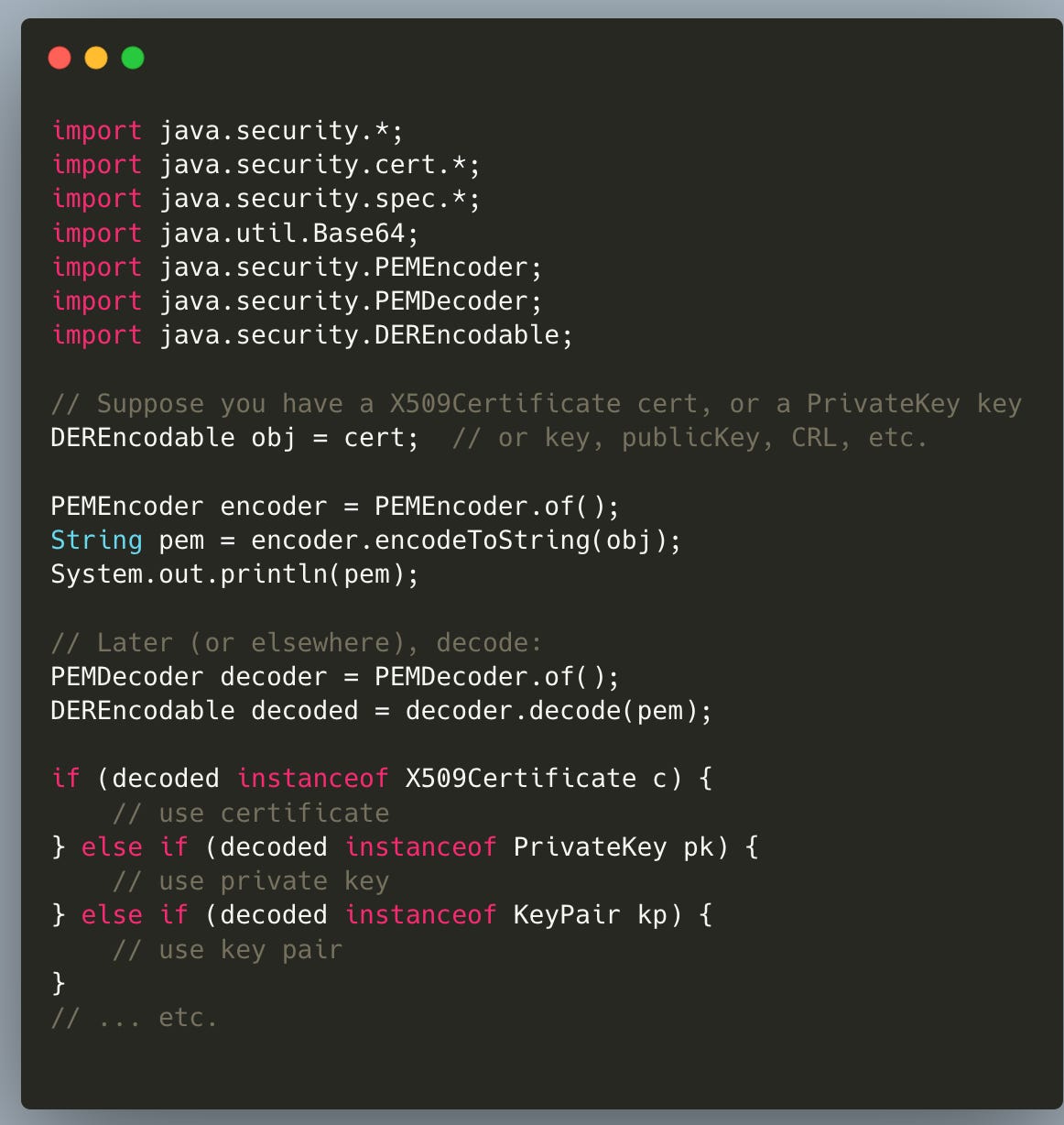 X509Certificate,PrivateKey,PublicKey, etc.) and wanted to export it as PEM (to write to file, send over network, interoperate with OpenSSL/SSH/other systems), there was no built-in Java API — you had to manually base64‑encode DER or use external libraries.PEM is extremely widely used (TLS certs, key stores, SSH, config files, certificates, CRLs, etc.). By adding native PEM support, Java becomes far more interoperable and convenient for security, devops, tooling, and integration workflows