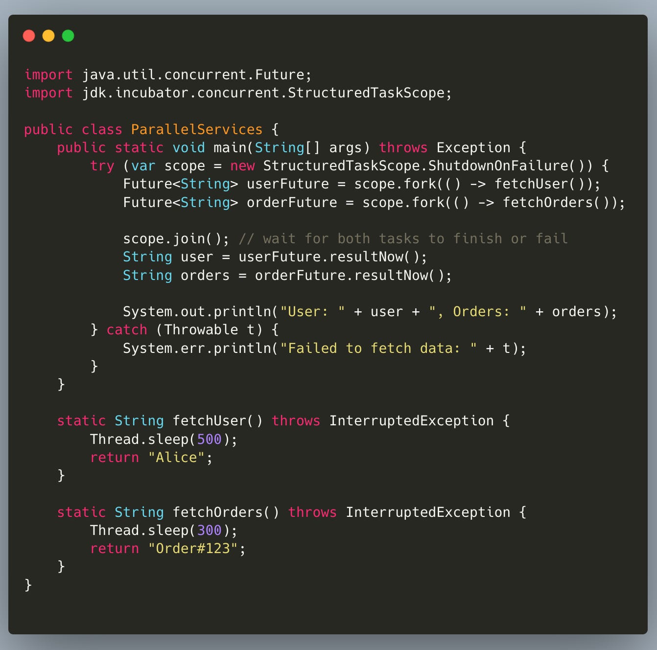 ShutdownOnFailureensures clean error handling.No manual thread pool management.