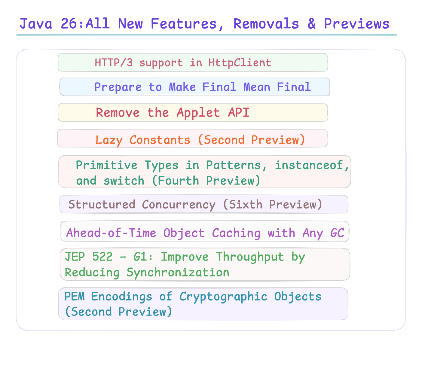Really solid compilation of what's coming in 26. JEP 522's reduced synchronization for G1 is particualrly interesting because throughput gains often come at latency costs, but this one seems to tackle both. The dual card table approach is clever, letting mutators run mostly lock-free while GC scans the alternate set. I'm curiuos though, for workloads with extremely high allocation rates, does the swap overhead between tables become noticeable, or is it mostly negligible under typical production scenarios?