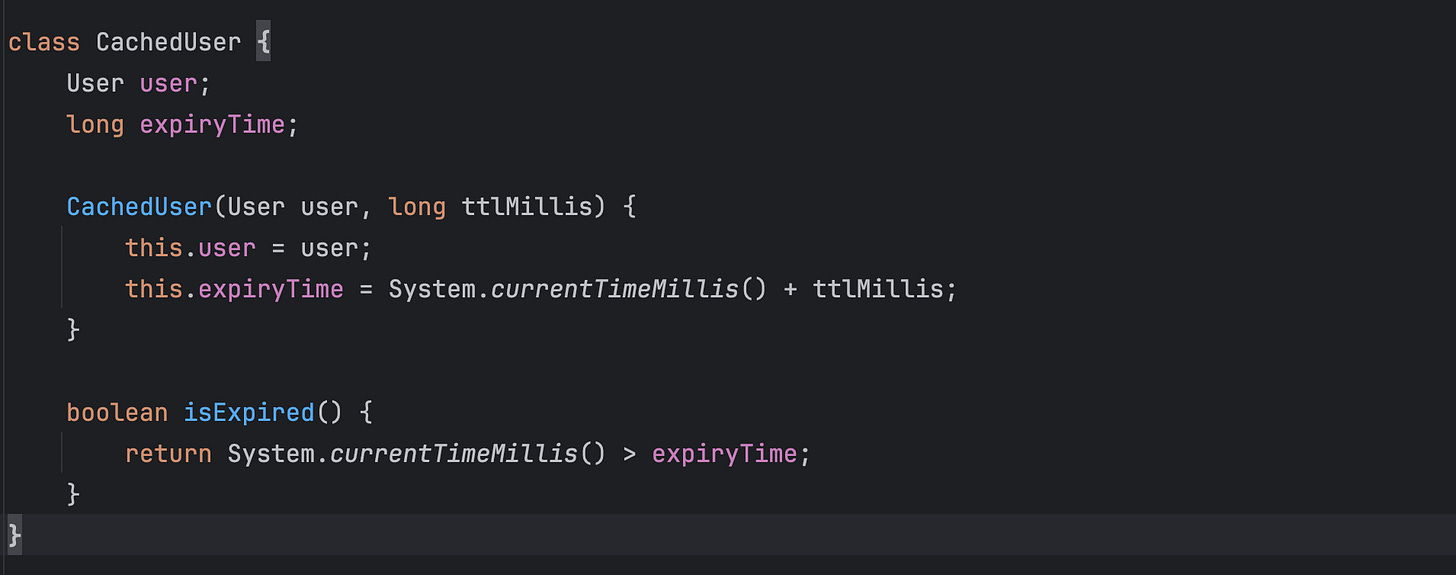 Client code stores all the cached users in a concurrent HashMap, which is thread-safe. It also defines TTL, which we set in the CachedUser object.