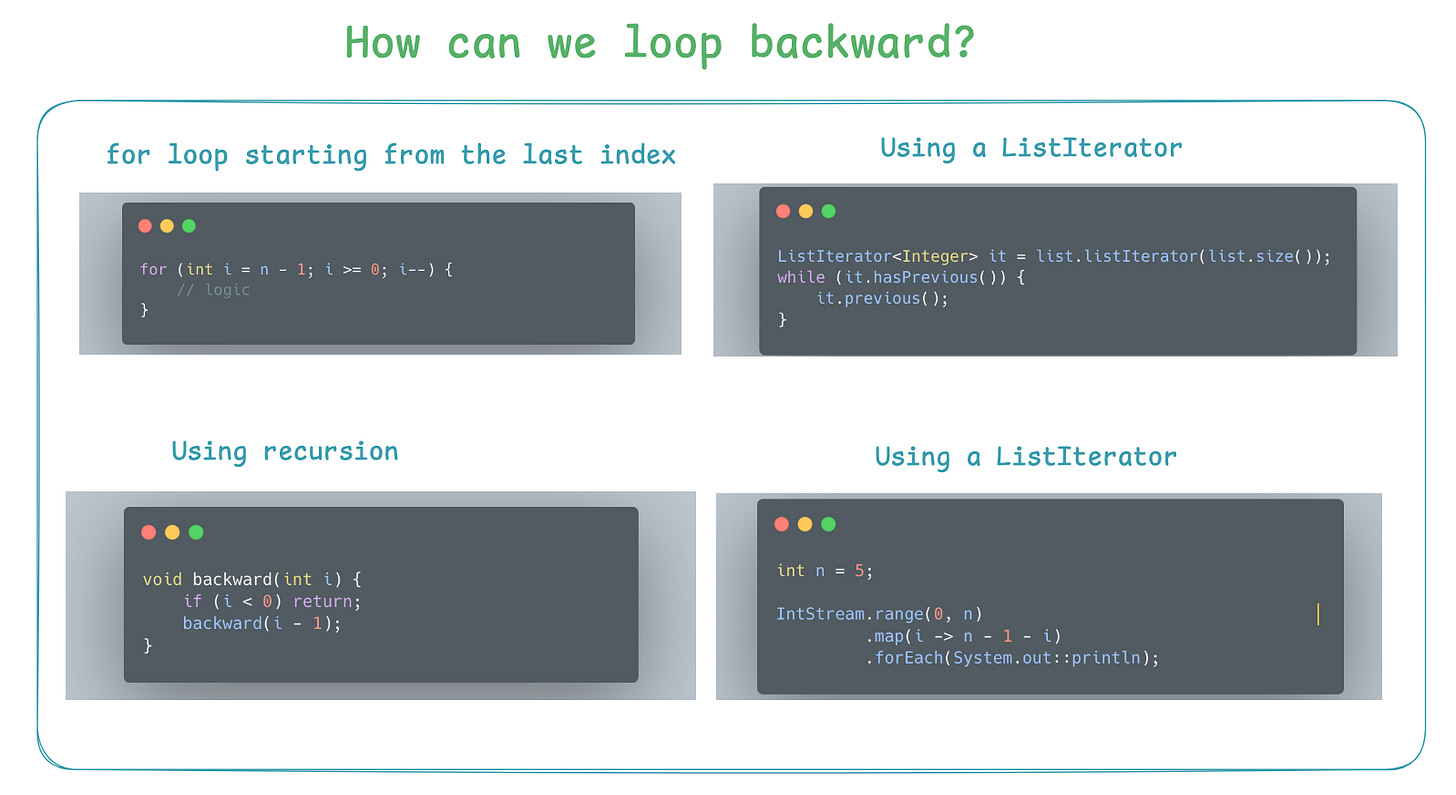 The most common and efficient way is to use a for loop starting from the last index and decrementing :
