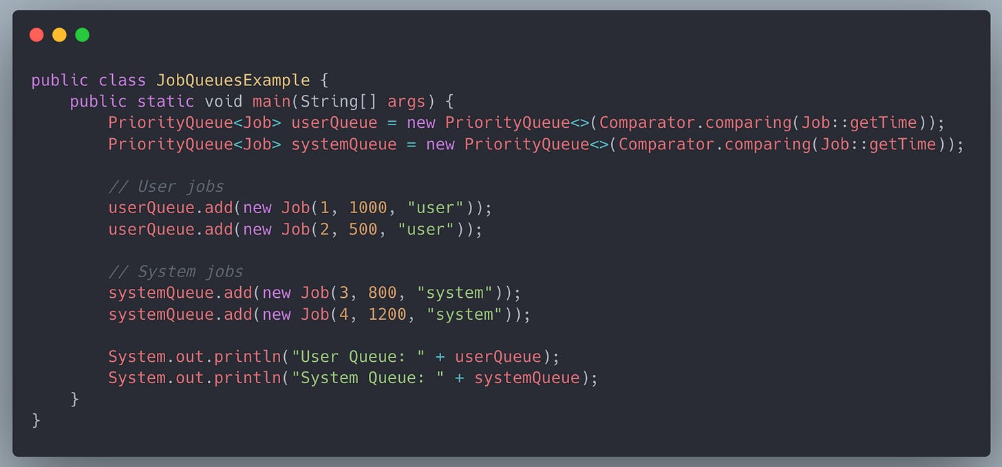 System.out.println(queue.poll()); // Job{id=2, time=1000}Expected output: Job 1 first, Job 2 second — deterministic.