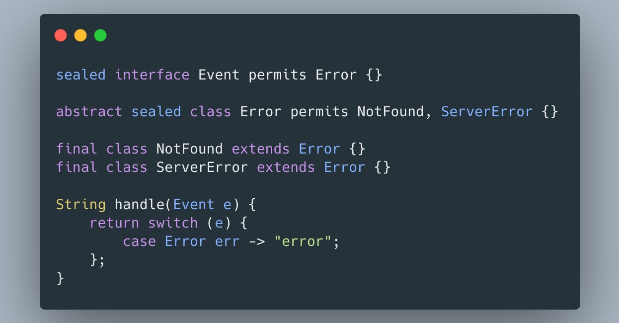 B. Because the switch must handle all concrete permitted subclasses of Event, but Error is abstract and cannot be the only case.