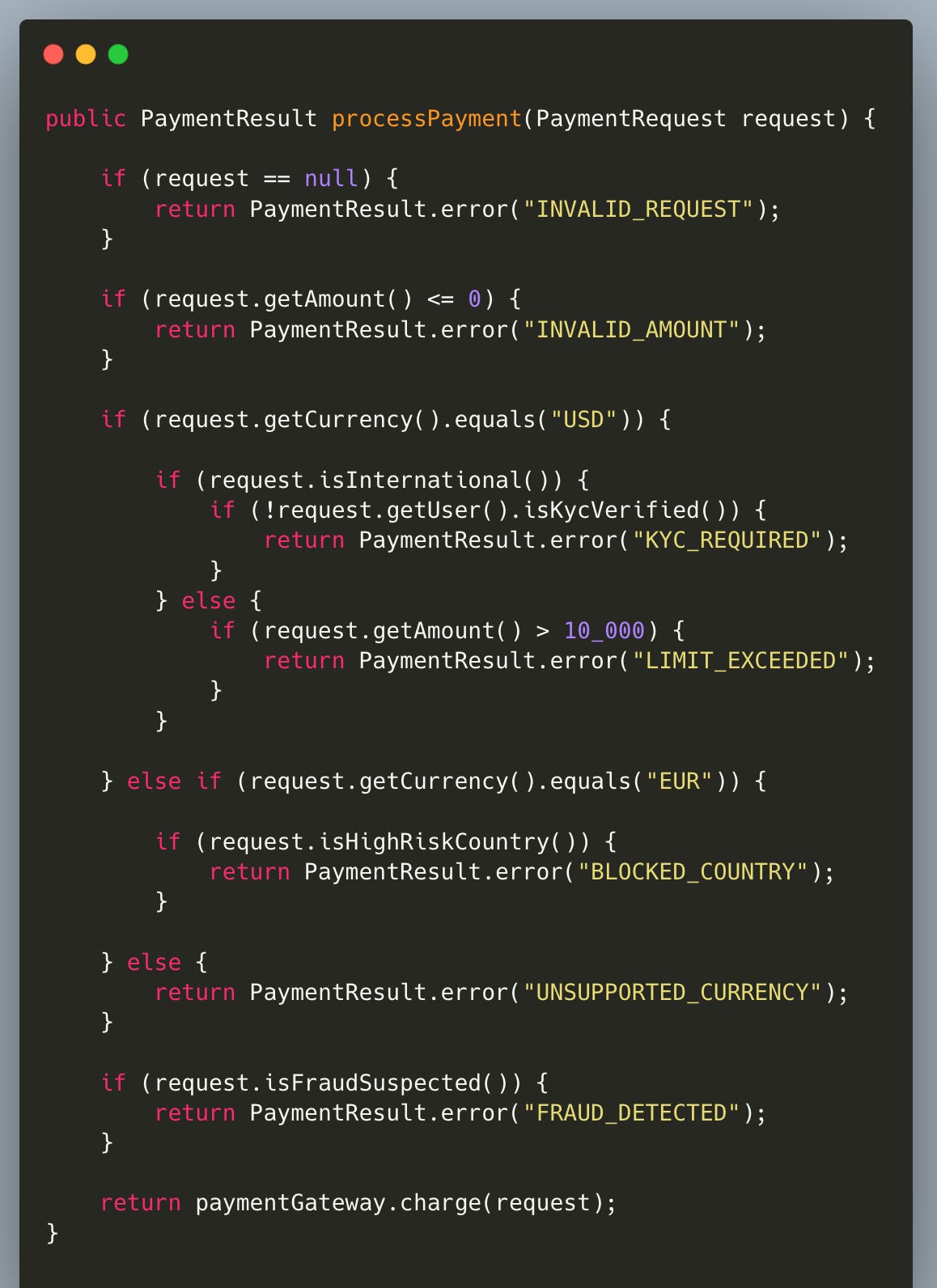 Key fact is we should separate decision logic from orchestration. Currently one method does validation, compliance, fraud checks, and execution.