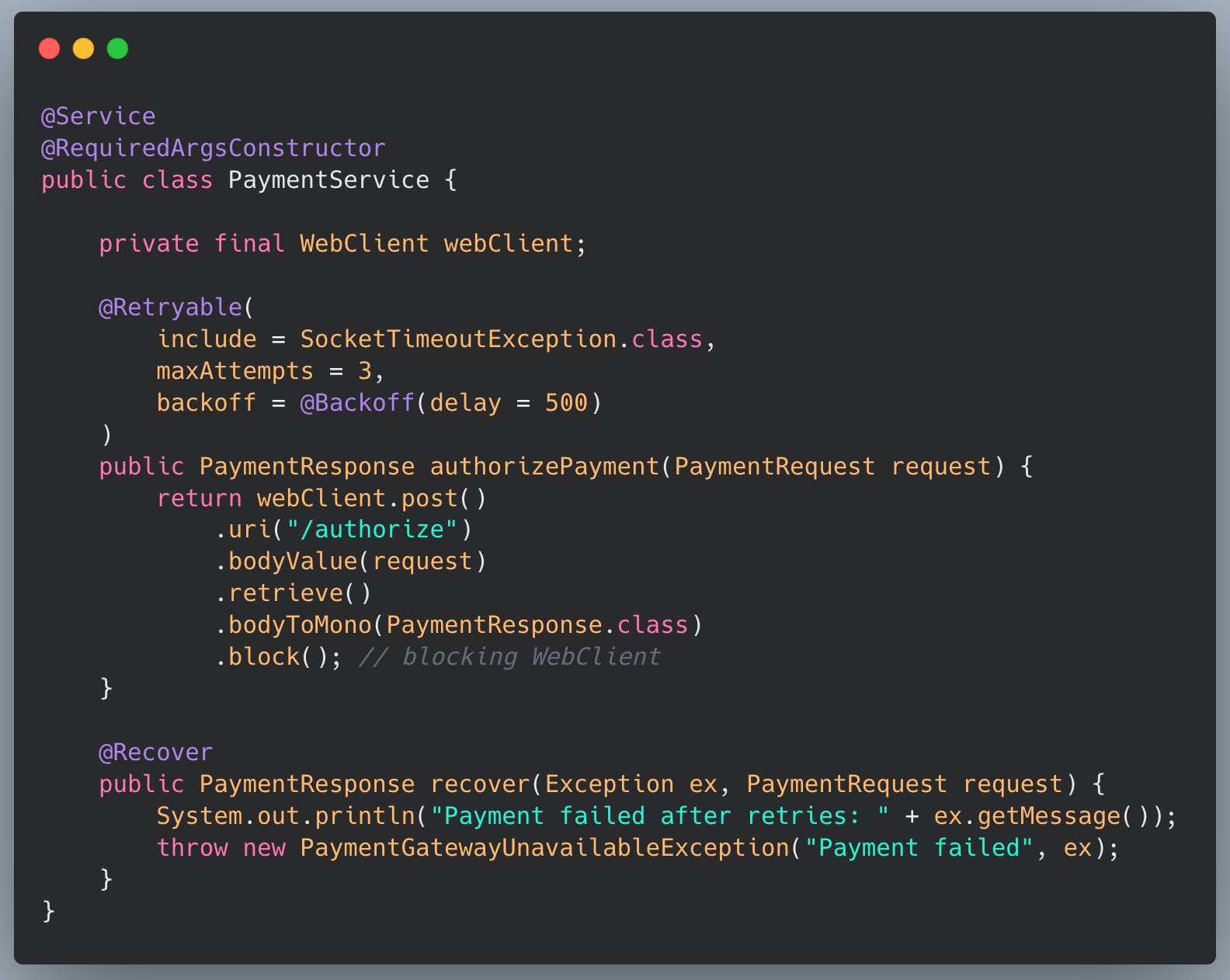 WebClientRequestException, notSocketTimeoutException.Result: Spring Retry ignores the wrapped exception, so no retries happen for network timeouts