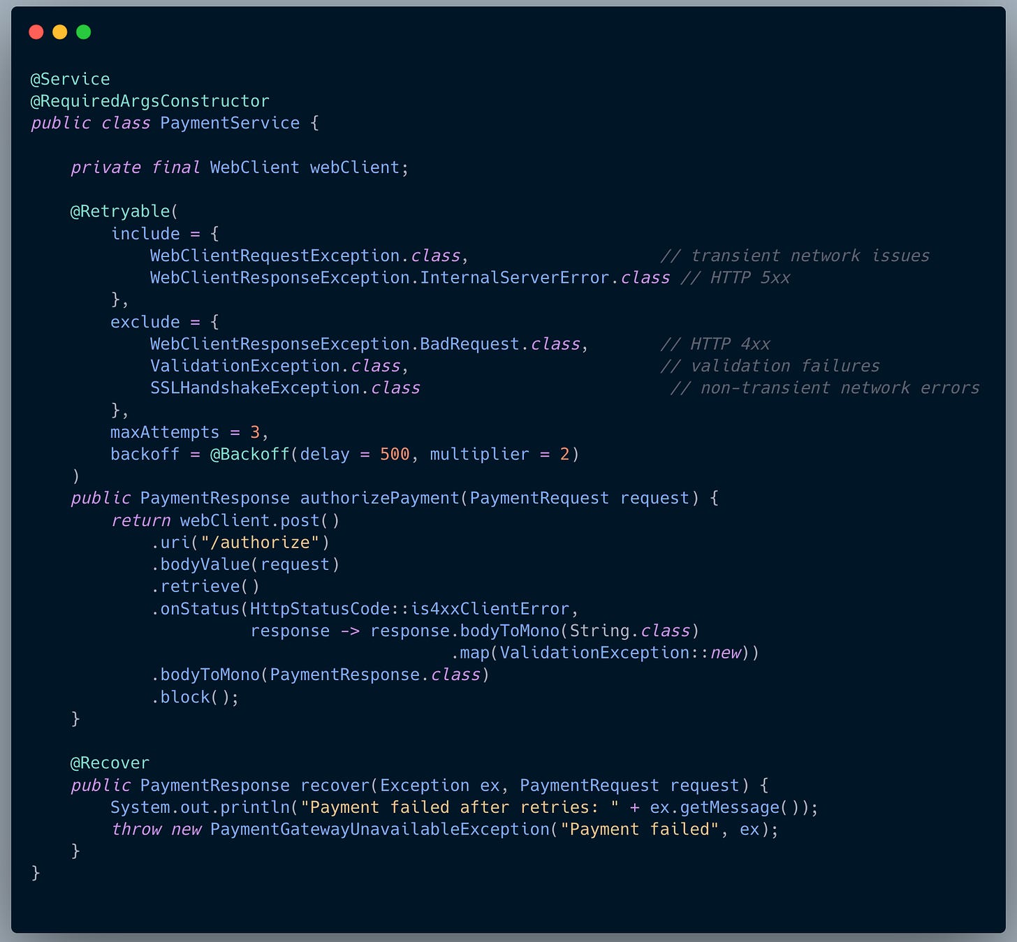 exclude = WebClientResponseException.BadRequest.classNon-retryable network errors (like SSLHandshakeException)