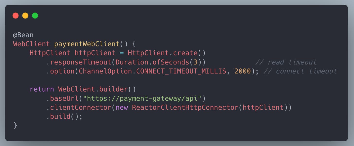 Without timeouts, blocked threads can pile up during traffic spikes, leading to retry storms or thread exhaustion.