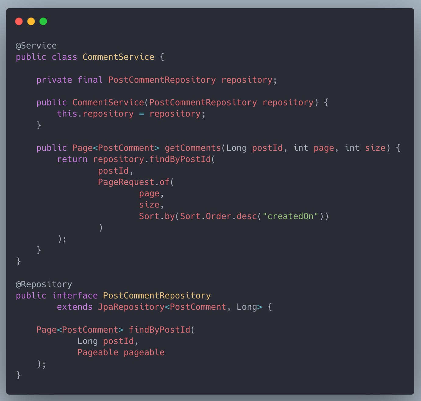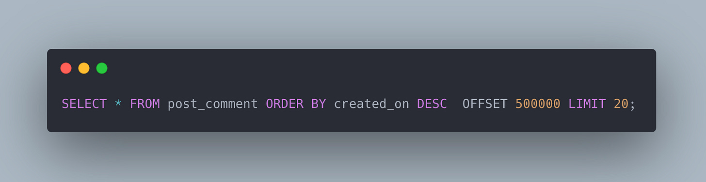 WHERE (created_on, id) < (:lastCreatedOn, :lastId)The database can only efficiently jump to this position if there’s an index on the columns used in the WHERE + ORDER BY clause.