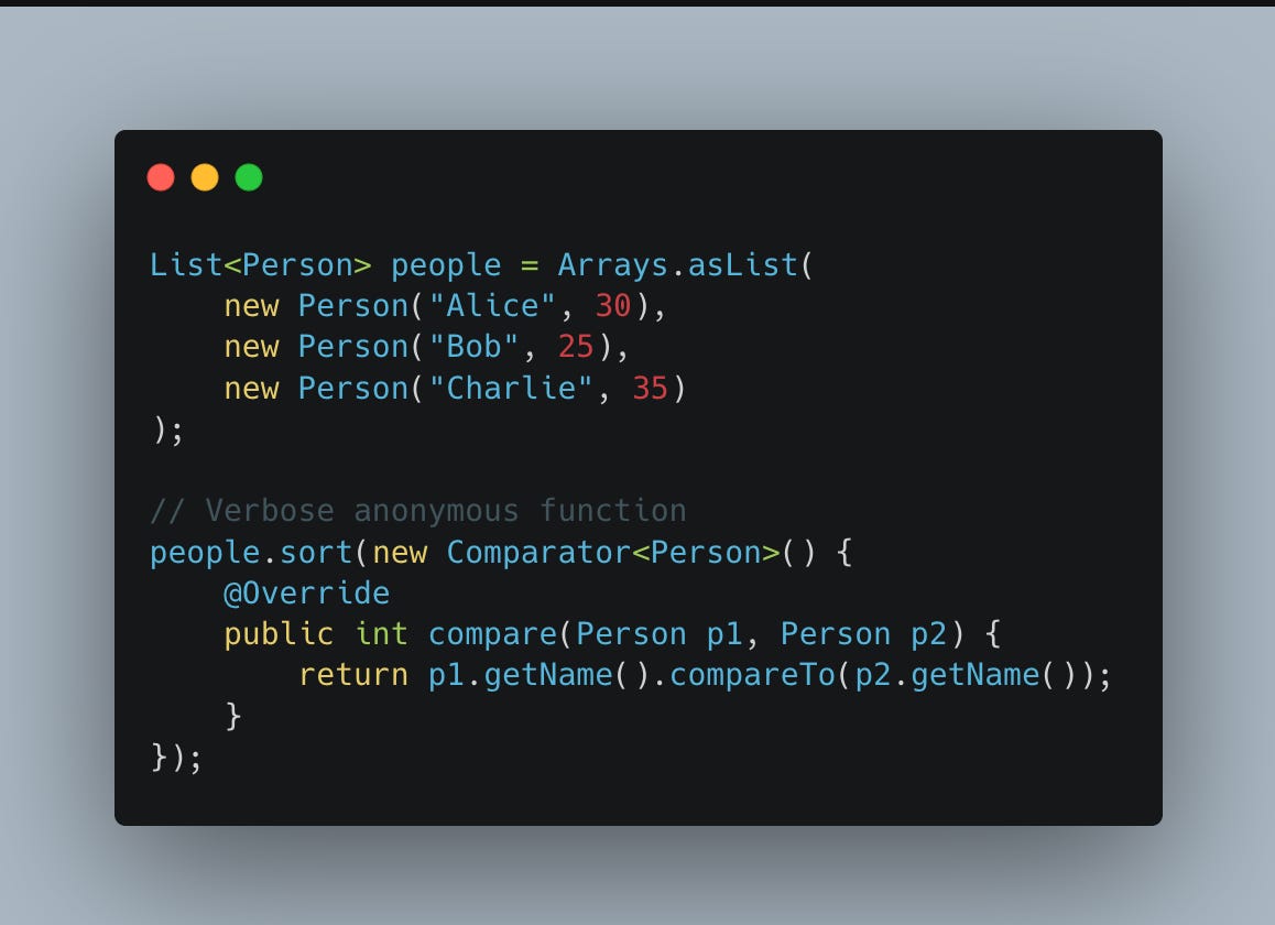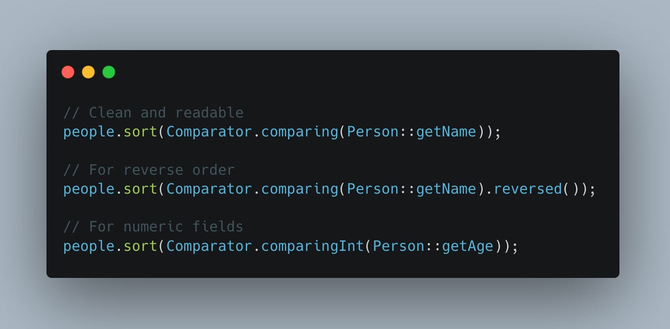 Instead of writing verbose anonymous functions, we can leverage Java 8’s method references and Comparator factory methods for cleaner, more readable code.