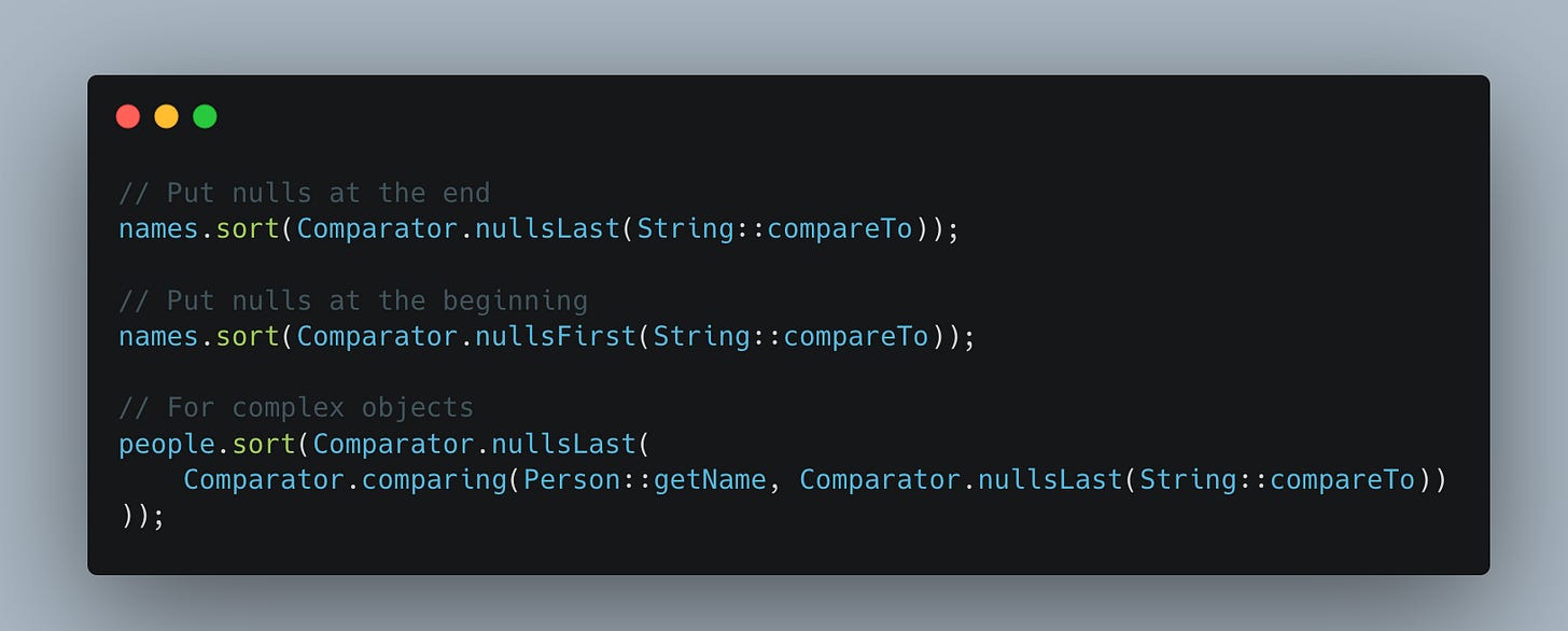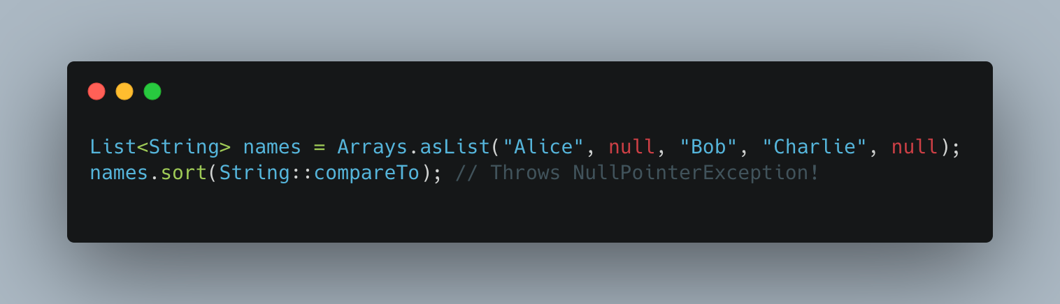 Null values in collections can cause NullPointerException during sorting. We can use nullsFirst() and nullsLast() to handle them explicitly.