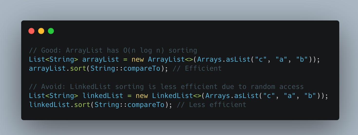 Different collection types have different sorting performance characteristics. We should choose wisely based on our use case.