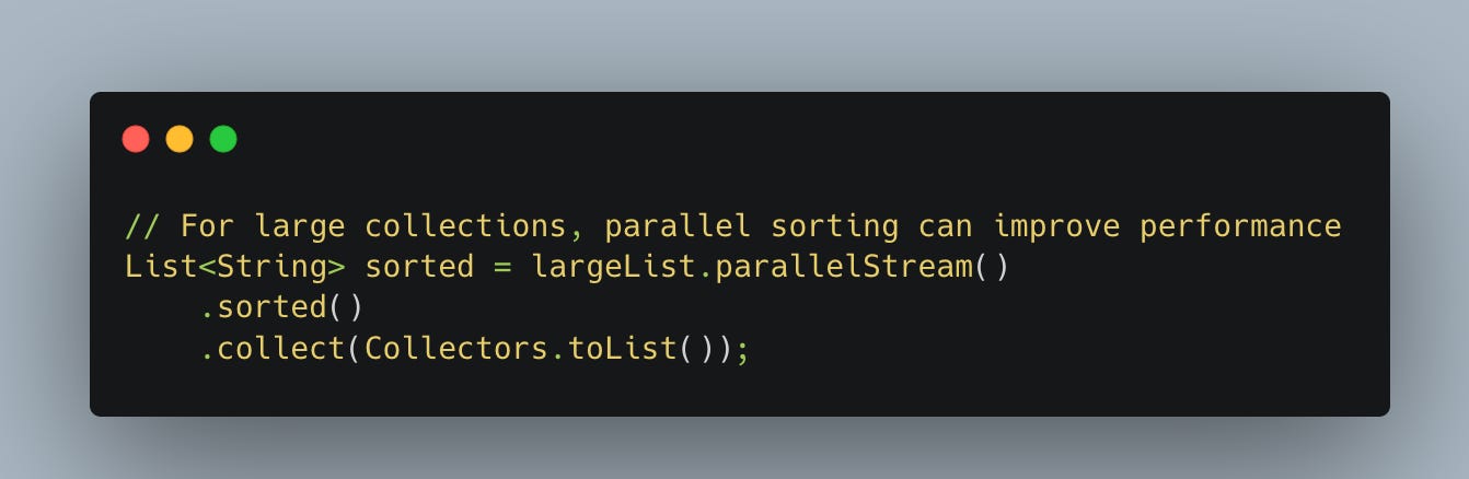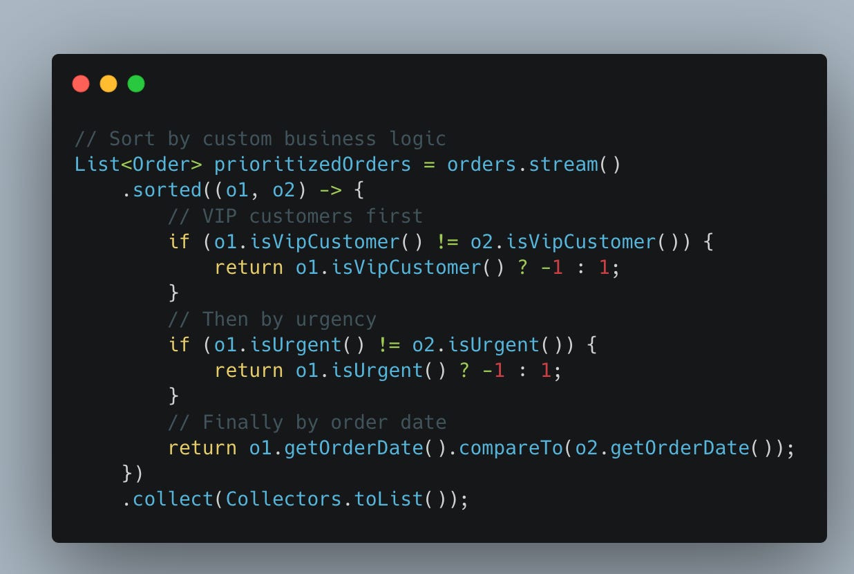 For complex sorting requirements or when we need to chain sorting with other operations, streams provide powerful and readable solutions.