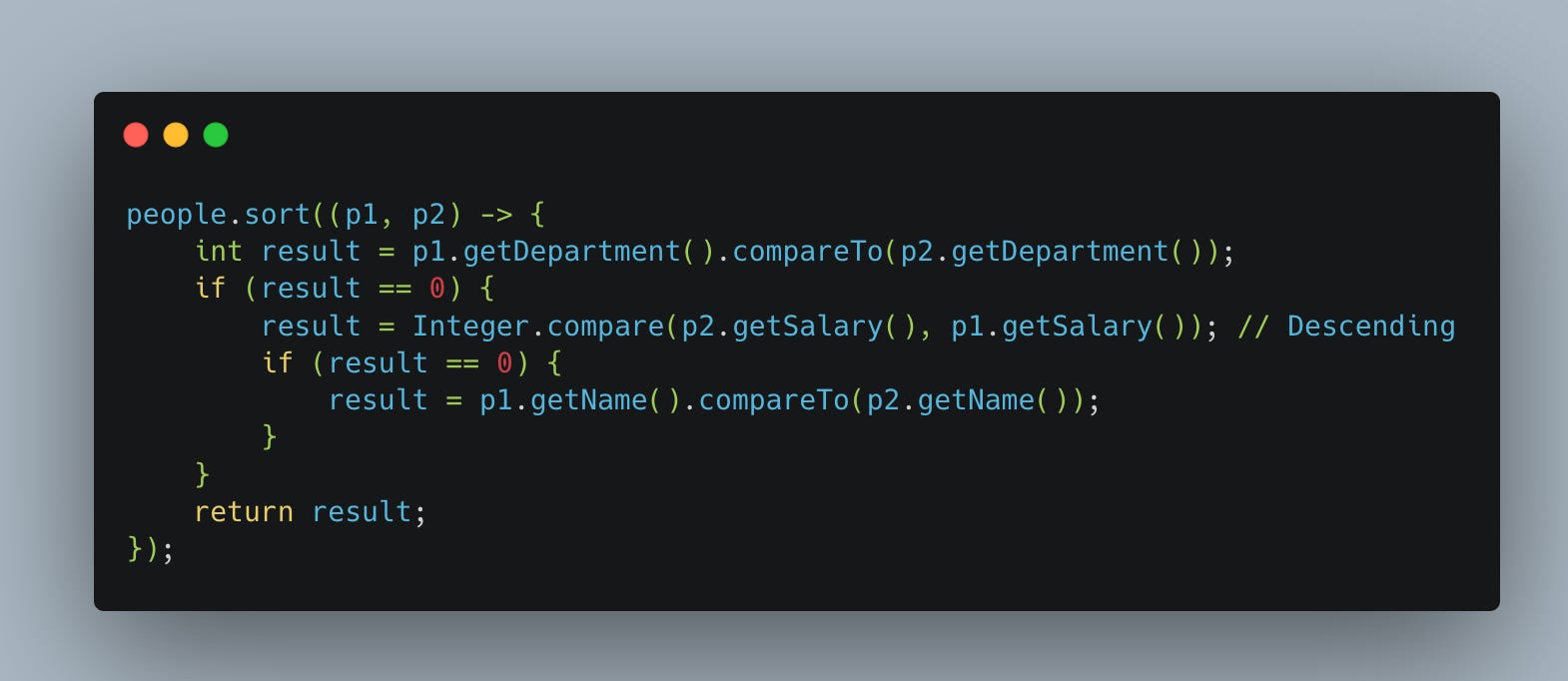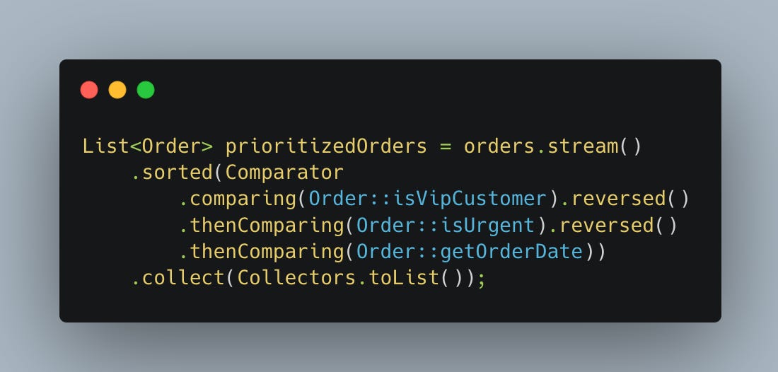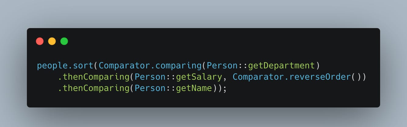 When we need to sort by multiple criteria, we can chain comparators using thenComparing() Instead of writing complex comparison logic.